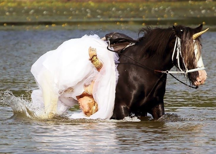Many of us with remember the television show Xena, The Warrior Princess who was a role model for many women back in the day. She was shown as riding a horse, and was the ultimate icon of female strength and beauty. No wonder this bride tried to re-create the magic of Xena on her wedding day while wearing her wedding dress. She seems to have directed her horse (dressed like a unicorn!) into a water body and something seems to have spooked the animal, as it has dropped its rider in a hilarious manner!