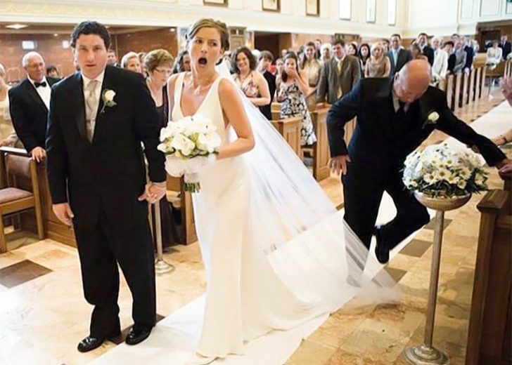 Dads can be a total mess when their little girls are finally standing at the altar, looking so beautiful in their wedding dresses, and they always reminiscence about the day when their girls were just born! But dads being dads, may not understand the importance of stepping in the right place when it comes to walking their daughters down the aisle! This man steps and trips over his girl’s veil and almost goes down, before steading himself. The girl doesn’t look too happy!