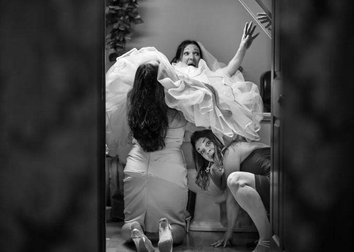 Bridesmaids… what would we do without them.! Besides having to look picture perfect in their beautiful gowns, they also have to do plenty of unglamorous tasks like helping the bride go to the bathroom, without ruining anything! And if that means following her to the bathroom and propping her dress up for her, so be it, as someone will be doing for you when it’s your wedding day! And what’s more is that the bathroom mirror hanging on the wall seems to be coming down on them, too. What a scene!